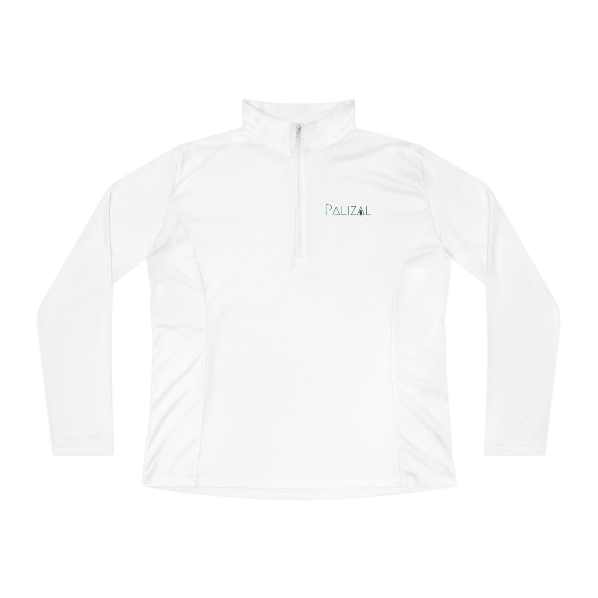 This womens athletic comfortable quarter zip pullover has our All Over The World design in green on the back. It has a cadet collar that helps layer and dress it up or down for any occasion. They're durable and will last for years. The drop tail hem creates a flattering silhouette. They also feature a reverse coil zipper that makes a more sleek and put-together look.