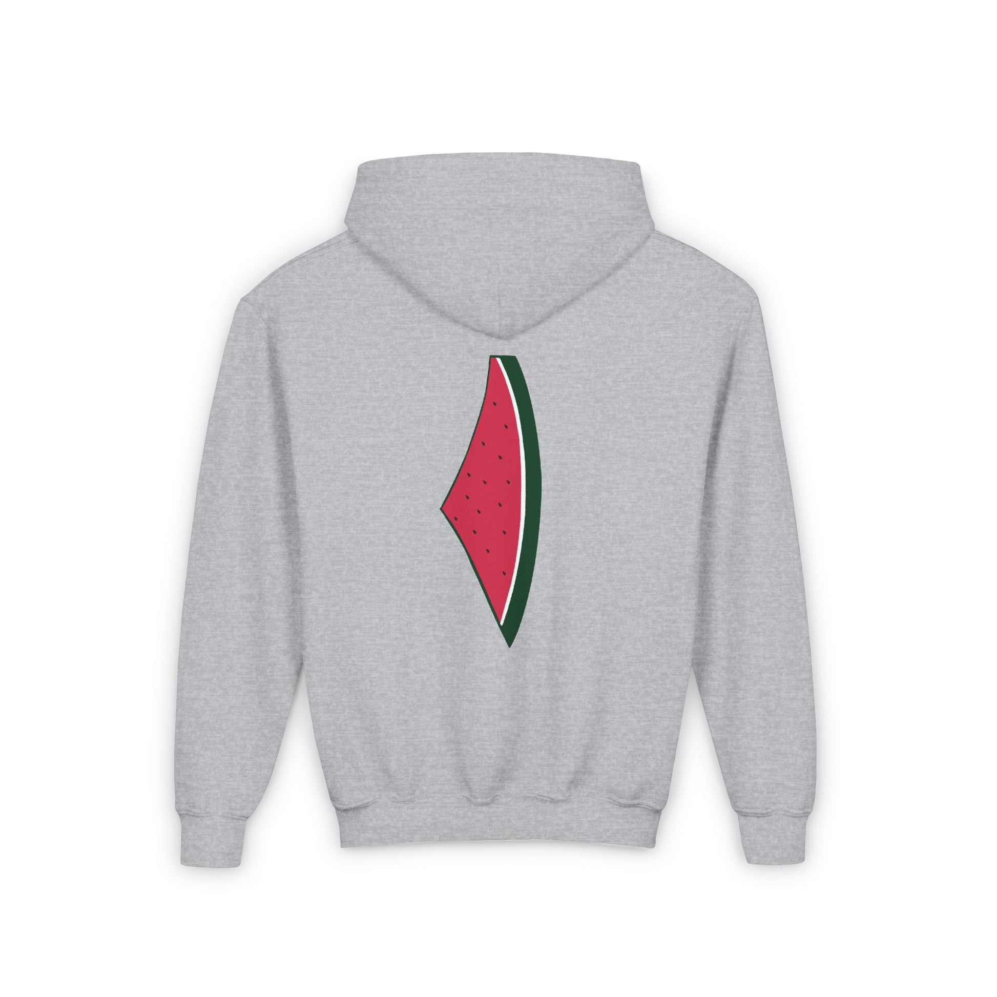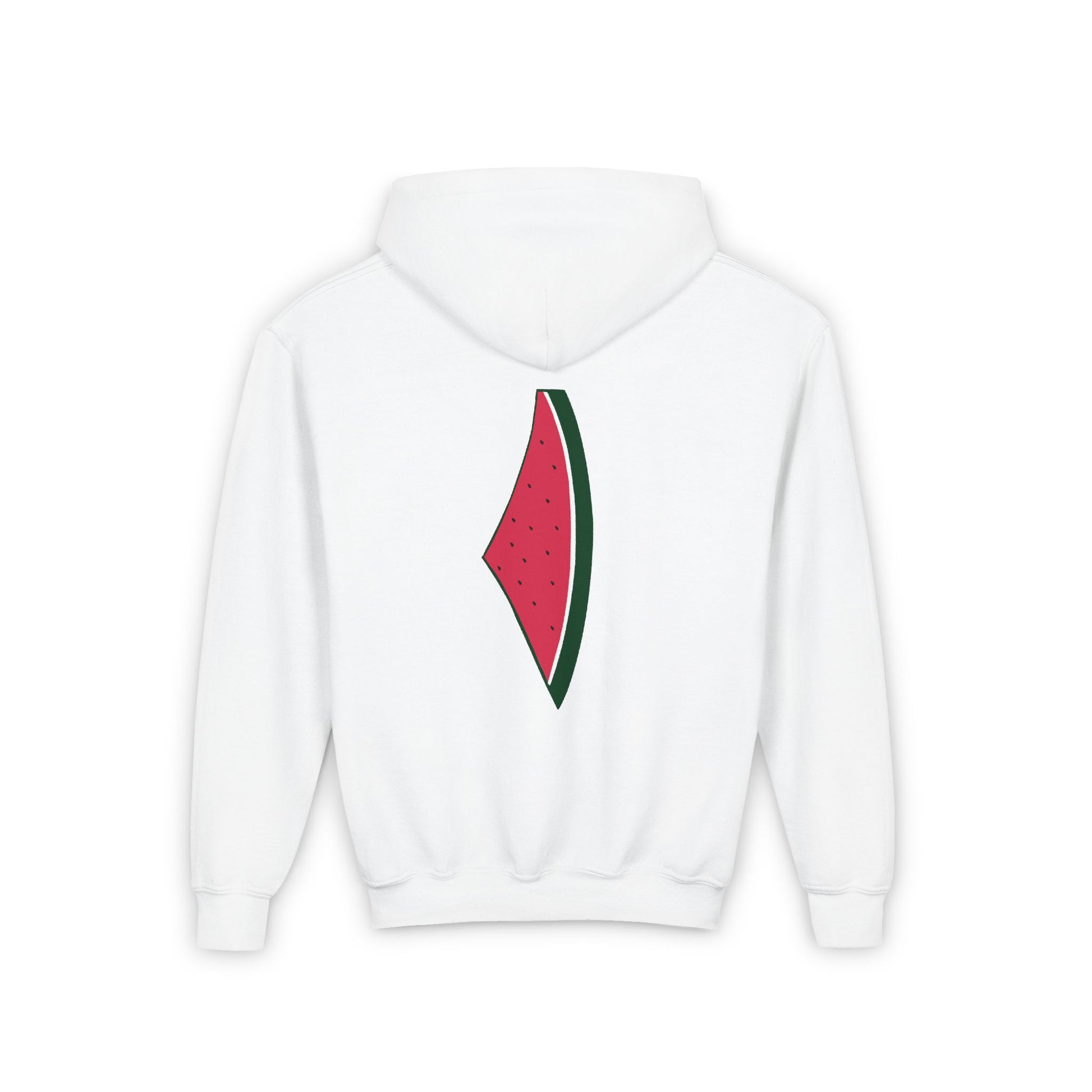 This teen hoodie has our "Palestine" design in the front with the watermelon design in the back to match our adult Sandia Graphic Hoodie. Please refer to the size chart below